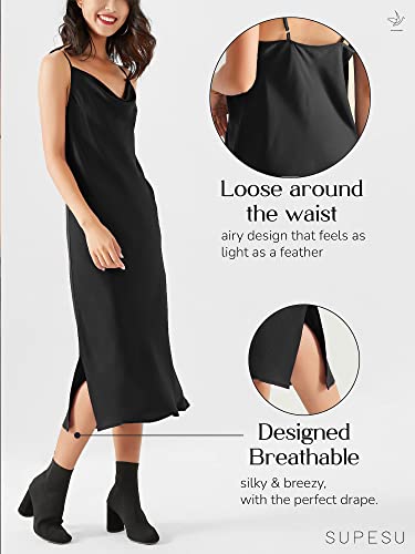 Fabric type: 100% PolyesterCare instructions: Machine WashOrigin: ImportedClosure type: Pull OnVERSATILE & contemporary: The SUPESU satin midi slip dress is perfect for any occasion. Wear it as a casual outfit, a chic layering piece, or as a stunning satin dress for women wedding guest. Pair it with heels for elegance or a jacket for a trendy fall look.LUXURIOUSLY SOFT & SILKY: Made from premium Paris Satin, this silk slip dress for women feels buttery smooth against the skin. Lightweight and breathable, itβs a must-have for summer wedding guest dresses for women or any event where comfort meets sophistication.FLATTERING COWL NECK DESIGN: Designed with a cowl neck dress silhouette and adjustable spaghetti straps, this midi slip dress for women offers a relaxed yet refined fit. The flowy, elegant drape complements all body types, making it effortlessly chic and feminine.PREMIUM QUALITY & CRAFTSMANSHIP: This satin slip dress for women is crafted with meticulous attention to detail, ensuring durability and lasting beauty. Whether worn for casual outings or formal events, its timeless design and superior fabric make it a wardrobe essential.LOW-MAINTENANCE & TRAVEL-FRIENDLY: With wrinkle-resistant fabric, this satin midi slip dress is always ready to wear no ironing needed! Perfect for travel, date nights, or weekend getaways, it keeps you looking effortlessly polished wherever you go. Perfect for everyday use. top-grade materials and excellent craftsmanship ensure long-lasting durability.