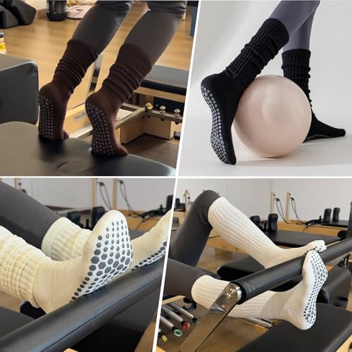 Pilates Socks with Grips for Women, 3 Pairs Long Scrunch Non Slip Yoga Barre Workout Slouch Socks