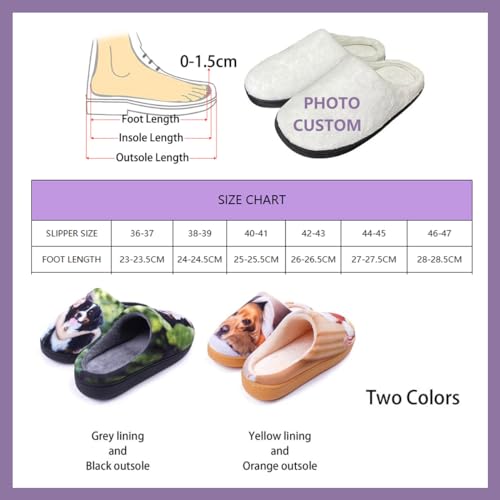 🟣Custom Photo Slippers. When it comes to comfort at home, nothing beats a good pair of warm slippers. It's cool to personalize your own photo house slippers by choosing the sole color and uploading your desired photo after order.🟣Premium Materials. Our custom slippers for women are super soft. The upper is made of polyester, the sole is made of TPR and the inside is flannel fleece fabric, which will retain its shape and dry quickly. It's warm. lightweight and warm to wear. Cost-efficient for comfort-loving customers.🟣Anti-Slip Soles. Non-slip outer soles provide a better grip. These custom slippers are safe for all kinds of activities on slippery floors. Break out into dance or carry your precious crockery without the fear of skidding.🟣All-Over Print. Our slippers for women indoor come up with fun and bright patterns, color schemes, even landscapes, animals, photos, and more. Our all-over print ensures full coverage of your design directly on the slippers.🟣Warm Personalized Gift. The indoor slippers are good gift choices for yourself, your family and friends. We believe that the exclusive home slippers for men will not only warm their foot, but also their heart. Please kindly check your foot length when choosing the size. Perfect for everyday use. finest materials and excellent craftsmanship ensure long-lasting durability.