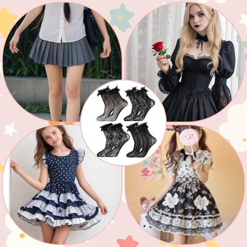 More information about 4 Pairs Black Lace Socks Lace Ruffle Socks Cute Lolita Sock Mesh Laces Sock for Women Ankle Ruffle (Jacquard/Big Heart/Sunflower/Small Heart)