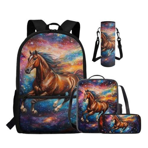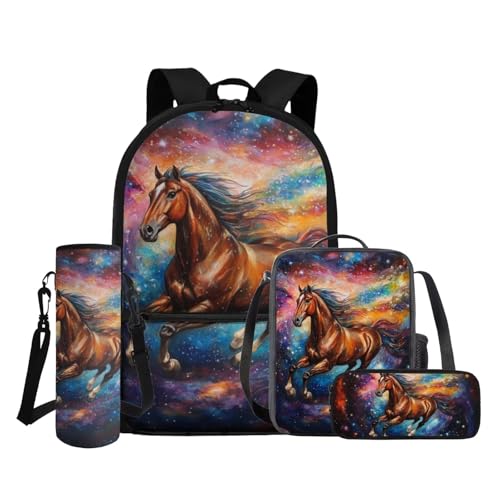 COEQINE Space Horses Print Backpack for Boys Girls Bookbag with Lunch Box & Pencil Case & Water Bottle Sleeve 4 in 1 Casual Outdoor Daypack Back to School Gifts