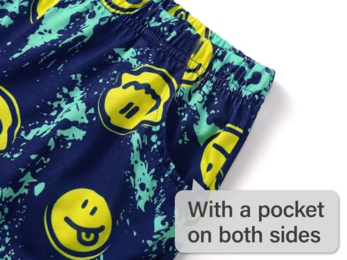 • *Features: This boys' pj features the yellow face graphic with the navy blue text of "chill out " on the left corner of teal top front. each-over the yellow smiling face print on the teal & navy blue pajama shorts, making this an extra fun and beloved casual clothes set for boy at bed time. Crewneck short sleeves on top. Pull-on elasticized waistband and side pockets on the PJ shorts for on-and-off convenience. The nighty with teal & navy contrast colors will make the boy stand out on Pajama Day.