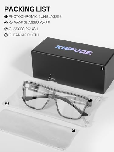 • 【Photochromic Lenses】 KAPVOE's photochromic lenses automatically adjust their tint in response to UV light, with a visible light transmission range of 15% to 85%. They darken to a deep gray under firm sunlight for effective glare protection and return to clear in low-light conditions to ensure optimal visibility. Suitable for various weather conditions, these lenses deliver a consistently relaxing and stable visual experience.
