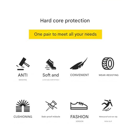 Sole material: RubberOuter material: ClothClosure type: Lace-UpWater resistance level: Not Water ResistantSteel Toe Shoes Power Trainers: Our steel toe shoes are tough enough to handle heavy impacts while keeping your feet comfortable all day long; slip them on and take on your shift with confidence; youβve got protection when it matters most.Puncture-Proof Midsole: Soft, tough, and puncture-resistant to safeguard against sharp objects like nails and metal shavings in any work environment.Breathable & Lightweight:Steel toe shoes come with fashion-sneaker design,breathable & soft & widened design upper keeps the feet fresh and feel comfortable without grinding feet ,reduces burden on you of hard working day.Elastic Shoes Opening: The top of the safety sneakers with upgraded high elastic opening for easy on and off while the ankle wrapping better.Versatile & contemporary: Perfect for both tough work sites and outdoor activities like hiking or rock climbing, offering both protection and style. Perfect for everyday use. finest materials and excellent craftsmanship ensure long-lasting durability.