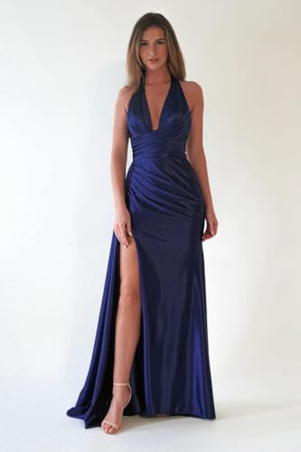 GUKARLEED Women's Ruched Satin Prom Dresses Mermaid Halter Formal Dress V Neck Ball Gowns Long Wedding Guest Dress with Slit