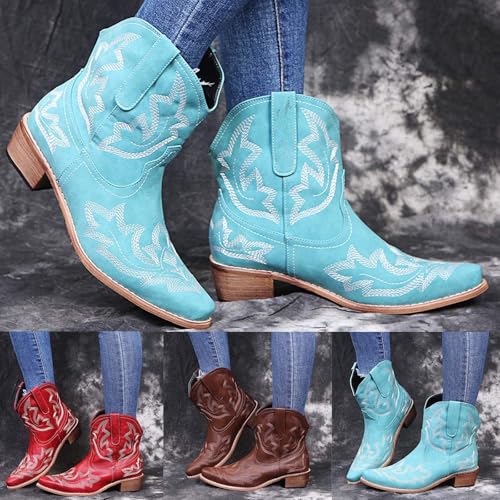 Cowboy Boots For Women 2025 Pointed Toe Wide Calf Western Flower Embroidered Chunky Heel Mid Calf Ankle Boots Retro Leather Western Cowboy Knee High Booties
