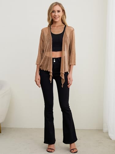 Fabric type: 65% Nylon, 35% Silver ThreadCare instructions: Machine WashOrigin: ImportedMaterial: This women bolero Thin Shrugs are made of 3/4 Sleeve Lightweight and breathable material, The fabric is very soft and comfortable, highly stretchy and skin-friendly. The women shrugs cardigan are comfortable for Spring, Summer, Fall wear.Features: Sheer mesh shrug cardigan,Front open cut design details, exquisite workmanship,Boleros shrugs, 3/4 sleeve design and a sophisticated tie-front closure. The cropped length makes it perfect for layering over your favorite dresses or tops, adding a chic and feminine touch to any outfitMatching: This is a great evening dress with a shrug, which can be perfectly matched with vests, T-shirts, swimsuit,sleeveless dresses and stylish boots etc., and can hide any problems with the upper arm. With this bolero, any outfit can instantly change from ordinary to stunningOccasion: This lightweight very soft sheer shrug cardigan is the perfect accessory that compliments almost any outfit. Date, party, leisure, travel, home, dinner, beach, very suitable for any formal occasion or daily life.Simply throw on and go. Never worry about exposed arms with your favorite dress againEasy Care: Our mesh knit shrug folds down to a compact size that fits in your purse and will never wrinkle. Pull it out, give it a shake. Seller note: Can be machine washed or hand washed. with cold water, dry flat. When traveling with the delicate shrug handle with care and love. For more length, tug gently.Due to the open weave, it does catch on things. Be mindful when wearing jewelry. Perfect for everyday use. superior materials and excellent craftsmanship ensure long-lasting durability.
