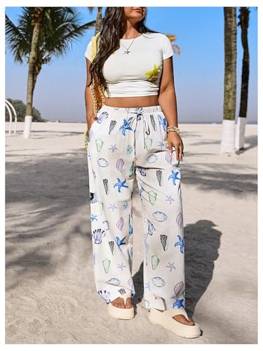 Why Choose MakeMeChic Women's Boho Plus Size Starfish Wide Leg Pants High Waist Tie Front Drawstring Trousers?