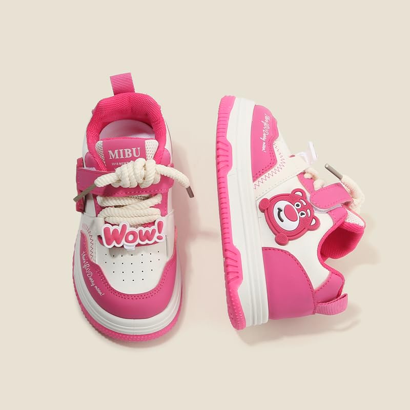 - DESIGN FEATURES: Adorable pink and white sneakers with cute bear charm detail and 'Wow!' accent for a playful, kid-friendly look