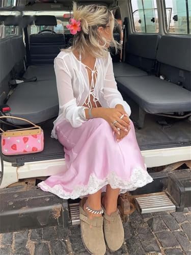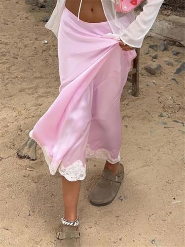 Women Elegant Pink Lace Casual Low Waisted Patchwork Skirts Streetwear Straight Ankle-Length Skirt