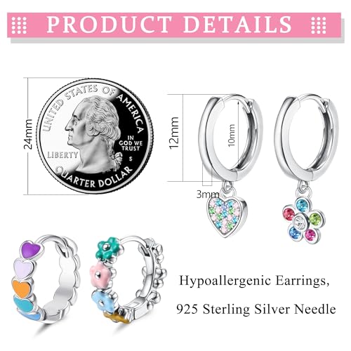 Florideco Hypoallergenic Small Hoop Earrings for Girls Women S925 Silver Needle Toddler Earrings Girls Hoop Earrings Dangling Huggie Teens Earrings Set for Sensitive Ears(over 4 years old)