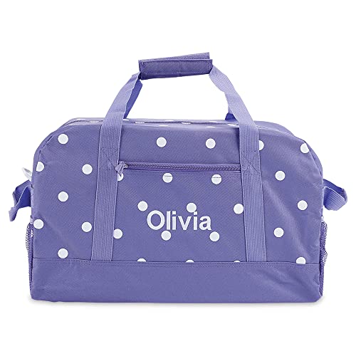 Lillian Vernon Personalized Duffel Bag for Kids, Roomy Purple and White Polka Dot Weekender With Front & Side Compartment, Customizable Girls Sports & Travel Bags With Custom Name, 9" x 10 ½" x 19"