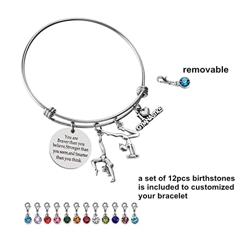 Item display length: 3.3 inchesMaterial: Stainless SteelMetal type: ZincClasp type: Lobster ClawChain type: Box ChainGem type: No gemstoneGYMNASTICS CHARM BRACELET: Gorgeous gymnastics bangle with you are braver than you believe... inspirational charm, 2 gymnast charms, I love gymnastics charms, a set of 12pcs birthstone charm for you to DIY, perfect gift idear for her.PERSONALIZED GYMNASTICS GIFTS: Comes with 12 birthstones, you can personalize this gymnastics bracelet with 12 birthstones to match different outfit, and each birthstone was labeled clearly for you to pick the birthstone you want.MATERIAL: Our gymnastics charm bracelet made of eco-friendly zinc alloy, with nickle and lead safe for daily wear. Smooth and light weight touch feeling will give you a soft wear experience.SIZE: high polished stainless steel, 2.4 inches in diameter (60mm), adjustable to fit most wrist size. Expandable bracelet with smooth edge is easy to take off and put on.AFTER SALES SERVICE: Free exchange or full money back within 90 days if you are not satisfied with gymnastics bracelet. Feel free to contact us if you have any questions. Perfect for everyday use. top-grade materials and excellent craftsmanship ensure long-lasting durability.