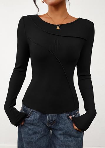 KIRUNDO Womens Tops Boat Neck Long Sleeve Ribbed Knit Slim Fit Stretch Shirts Workout Going Out Top Early Fall Fashion