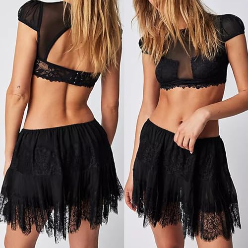 Women Y2k Lace Mini Skirt Fairy Mesh Floral Mid Low Rise Ruffle Half Slip Skirt Layered Flowy Short Skirt Streetwear