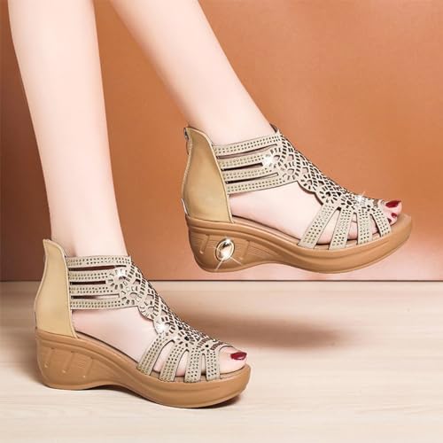 sizzling ! Womens' Open Toe Leather Rhinestones Wedge Sandals,Casual Hollow Out Slip-On Back Zipper Low Heel Roman Shoes,Fashion Lightweight Wedding Party Dress Shoes