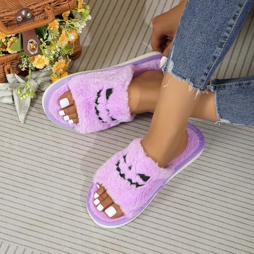 Slippers for Women 2025,Women's Spooky Slides Halloween Slipper Lantern Pumpkin plush Plush Cozy Open Toe Indoor Outdoor Fuzzy Slippers