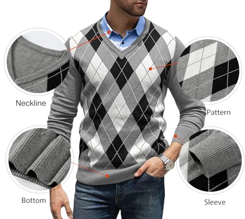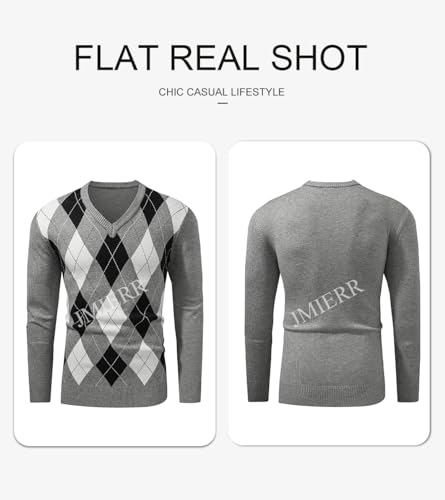 JMIERR Mens Sweaters Casual V Neck Ribbed Knit Slim Fit Long Sleeve Argyle Pullover