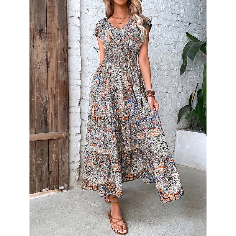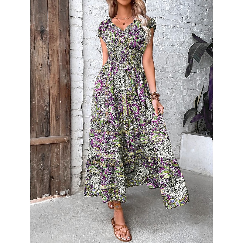 Highlights [Fabric]: Crafted from high-quality polyester and faille, this women’s dress offers a micro-elastic fit that ensures comfort and freedom of movement. The soft, breathable fabric is perfect for warm spring and summer days, allowing you to stay cool and sophisticated. [Fit]: Featuring a loose-fit design, this maxi dress offers a flowing, relaxed silhouette that flatters all body types. The smocked bust accentuates the waist, providing a secure fit while adding texture and dimension. The dress flares gracefully downward from the waist, offering an elegant and sophisticated look. [Design Highlights]: The dress boasts a captivating bohemian design with vibrant floral, paisley, and tribal prints that create a rich and colorful aesthetic. A flattering V-neckline and short sleeves enhance its feminine appeal, while the ruched and printed details add unique visual interest. [Occasions]: This versatile swing dress is perfect for a variety of occasions including vacations, holidays, daily wear, and outdoor events. Whether you’re attending a casual beach gathering or enjoying a daily outing, the dress captures the essence of free-spirited style with a touch of elegance. [Size Range]: Available in a range of sizes from S to 3XL, this dress caters to a variety of body types, ensuring a comfortable and flattering fit for everyone. Perfect for everyday use. superior materials and excellent craftsmanship ensure long-lasting durability.