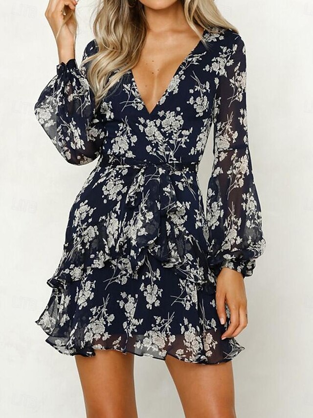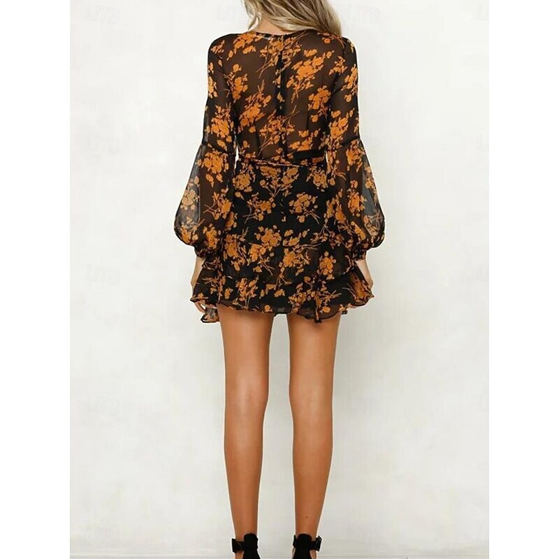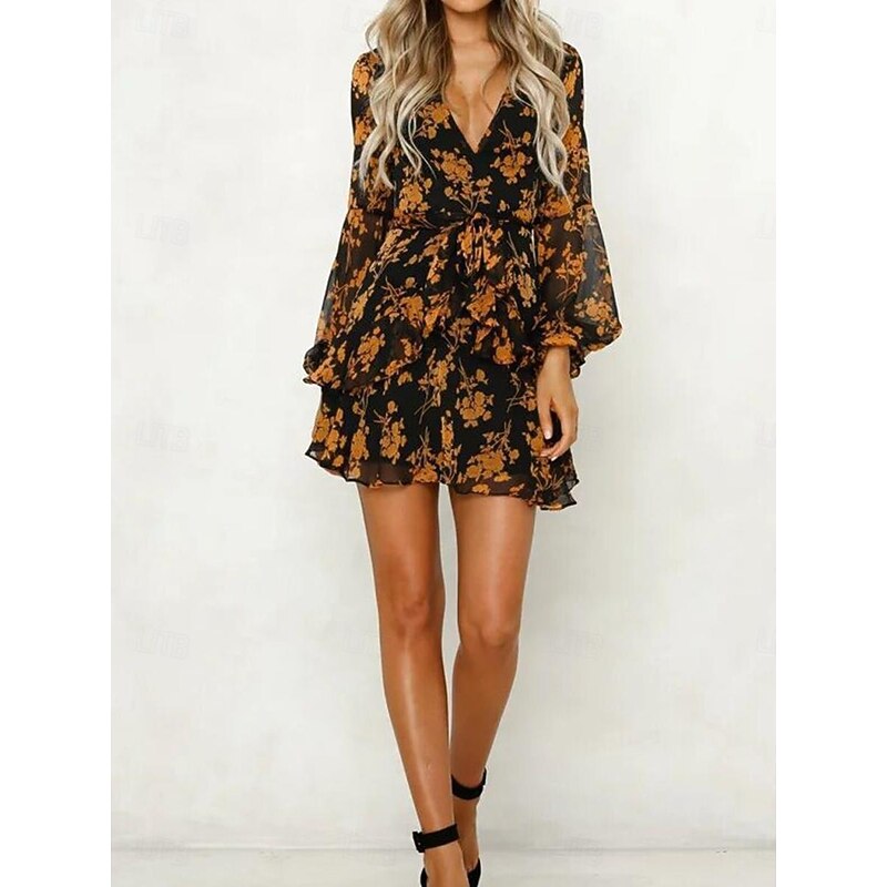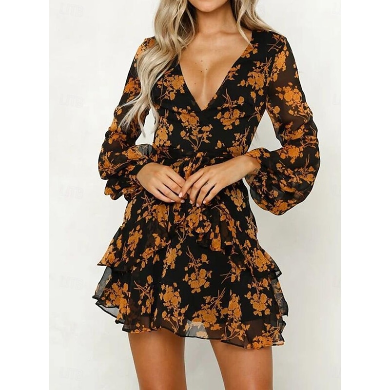 Highlights [Fabric] : Made from high-quality polyester, the dress exudes a lightweight and semi-sheer allure suitable for the fall season. The fabric offers a micro-elastic quality, ensuring comfort and ease of movement. [Silhouette] : This casual mini dress features a regular A-line fit, which cinches at the waist to elegantly highlight your figure. Its tiered, ruffle hem adds a flirty touch to its stylish silhouette. [Design Highlights] : The dress showcases a feminine floral print, beautifully laid out on a dark backdrop. With a deep V-neckline that adds sophistication, and long, slightly puffed sleeves gathered at the wrists, the dress delivers a romantic and airy feel. [Occasions] : Whether you're heading out for a date, leisurely vacation, or simply running daily errands, this dress is versatile enough to suit all these occasions. Its flirtatious yet elegant design makes it ideal for both daytime and evening events, adding charm to your attire. [Size Range] : Available in sizes S, M, L, XL, and 2XL, this dress is designed to fit a wide range of body types, accommodating your specific fit preferences and ensuring a flattering appearance. Perfect for everyday use. finest materials and excellent craftsmanship ensure long-lasting durability.
