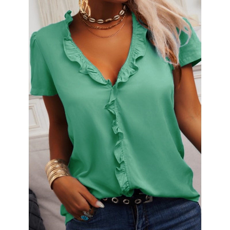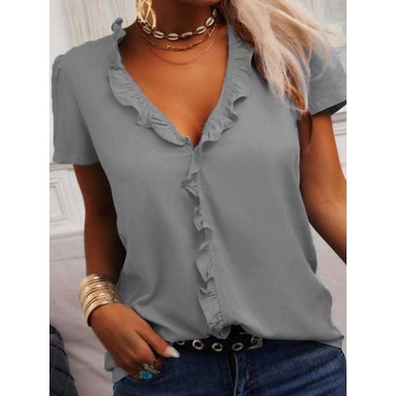 This Women's Shirt Blouse Solid Color Casual Short Sleeve V Neck Regular Tops Daily Ruffle Black White Blue Green Gray Summer combines elegant design with practical functionality. Every detail has been carefully considered to ensure you get the best possible experience. The outstanding construction means this product will serve you well for years to come.