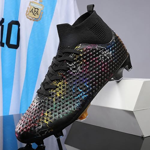 Sole material: RubberOuter material: RubberClosure type: Lace-UpExperience superior performance with our football shoes, featuring a lightweight and durable upper designed with a textured surface for enhanced ball control and movement.Our soccer cleats boast exceptional abrasion resistance and provide optimal stability on firm natural ground, ensuring a soft and secure fit.Engineered with a durable and breathable upper, these men's soccer shoes promote efficient air circulation between inner and outer layers, offering exceptional breathability to keep your feet dry and comfortable throughout the game.The high-top design of our soccer sneakers delivers ample ankle support, helping to prevent injuries during rigorous exercise and intense gameplay.Versatile and accommodating, our football boots are perfect for teenagers, big kids, and adults of all genders. Ideal for various occasions and terrains such as competitions, running, hiking, walking, soft and firm ground, hard ground, natural grass, rubber playgrounds, and artificial surfaces. Perfect for everyday use. top-grade materials and excellent craftsmanship ensure long-lasting durability.
