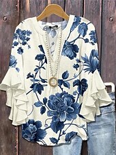 This Women's Blouse V Neck Floral Graphic Bohemia Vintage Daily 3/4 Length Sleeve Flutter Sleeve Regular Tops Daily Holiday Vacation Wear Ruffle Print Blue Light Blue Summer Spring Fall combines elegant design with practical functionality. Every detail has been carefully considered to ensure you get the finest possible experience. The finest construction means this product will serve you well for years to come.