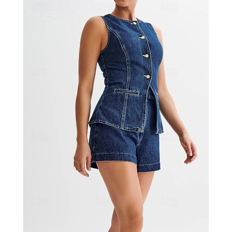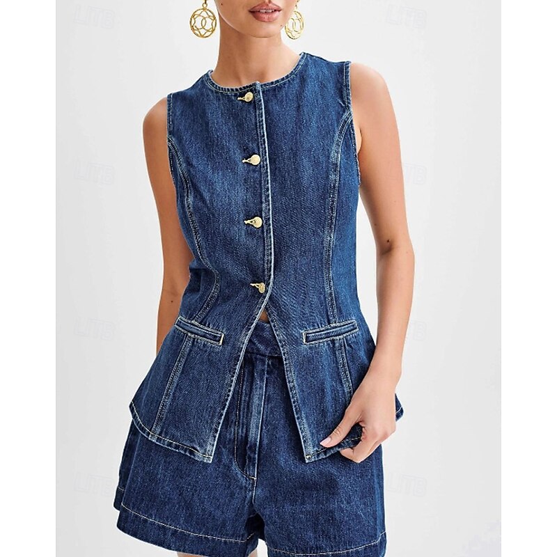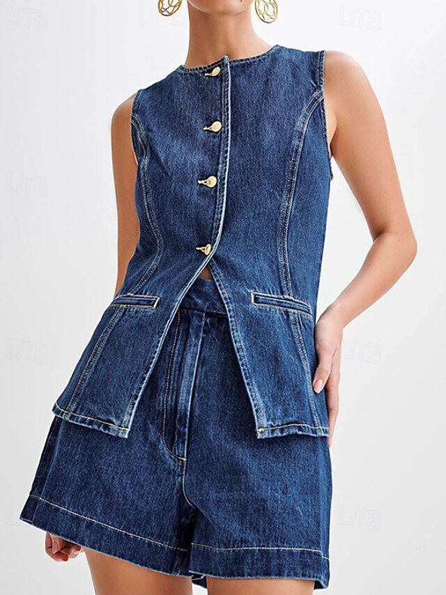 More information about Women's Active Fashion Blouse Shorts Sets Sleeveless Crew Neck Solid Color Split Thigh Vacation Casual Daily Blue Summer Regular Fit