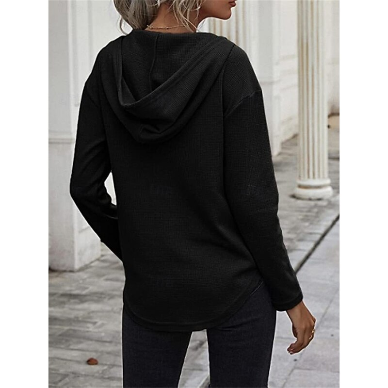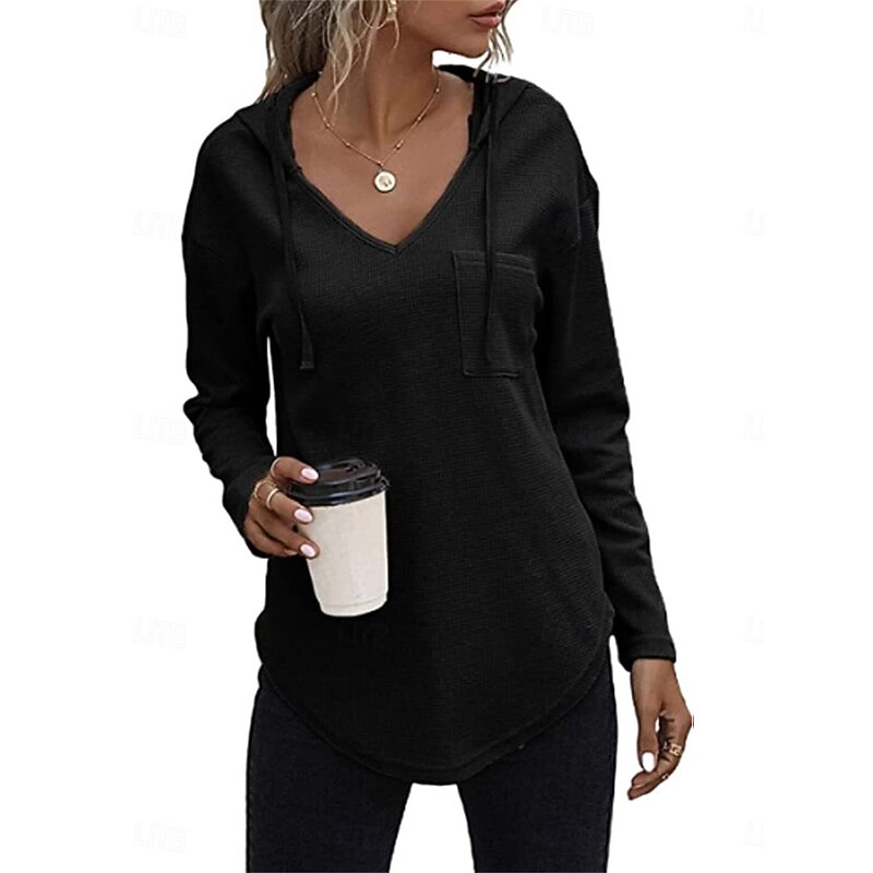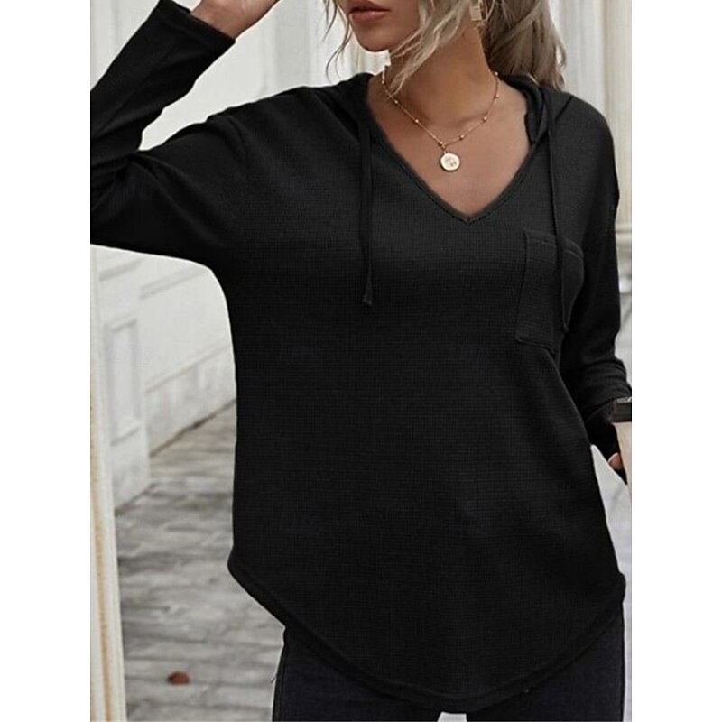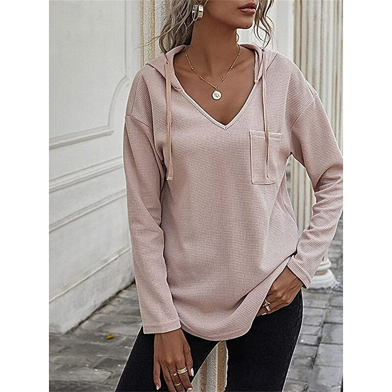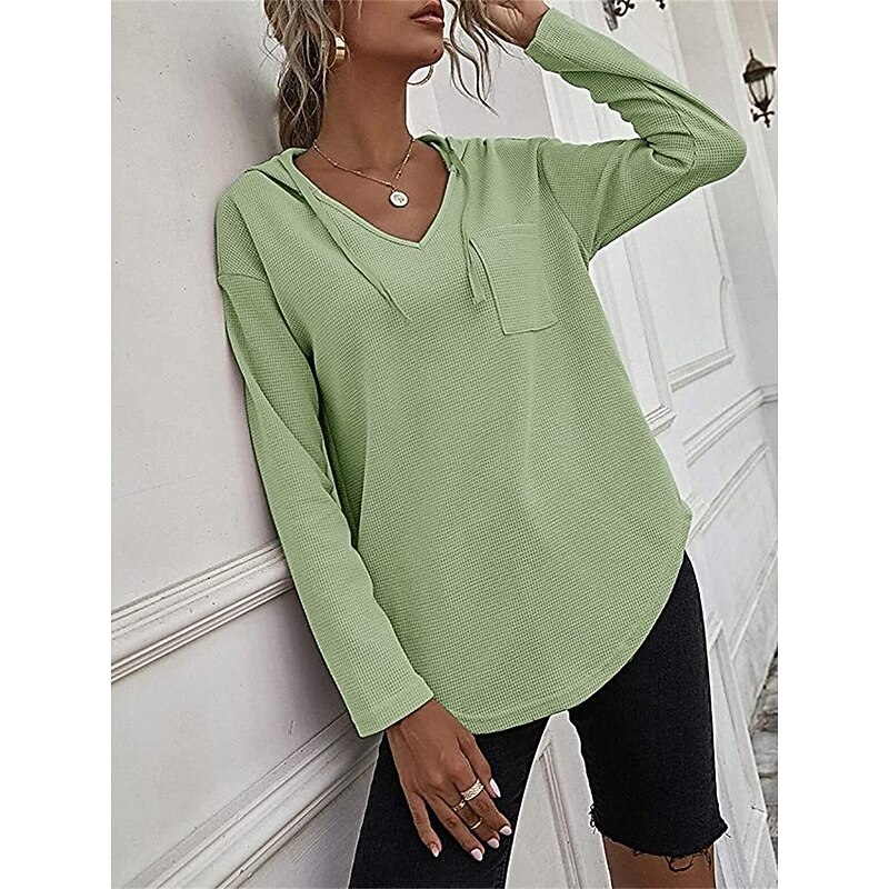 Highlights [Fabric] Crafted from high-quality polyester, this women's shirt blouse offers a casual yet modern vibe with its textured knit pattern. The fabric is lightweight and micro-elastic, ensuring comfort and ease of movement throughout the fall and winter seasons. [Fit and Style] Featuring a regular fit and long sleeves, this top is designed to provide a relaxed, laid-back style perfect for daily wear. The versatility of the regular-length top makes it an excellent choice for layering or wearing as-is during transitional weather. [Design Highlights] The blouse is designed with a chic V-neckline that adds a touch of femininity, while the attached hood and drawstrings introduce a sporty, contemporary appeal. A subtle chest pocket adds to the casual, functional design, enhancing its everyday wearability. [Occasions] Ideal for daily activities, this top can be effortlessly paired with jeans or leggings, making it suitable for casual outings, weekend get-togethers, or cozy days at home. Its solid color design ensures it complements a variety of styles and occasions. [Size Range] Available in a range of sizes from S to 2XL, this blouse caters to different body shapes and preferences, offering a comfortable and contemporary fit for everyone. The color options include green, black, and pink, allowing for personal expression through choice of hue. Perfect for everyday use. top-grade materials and excellent craftsmanship ensure long-lasting durability.