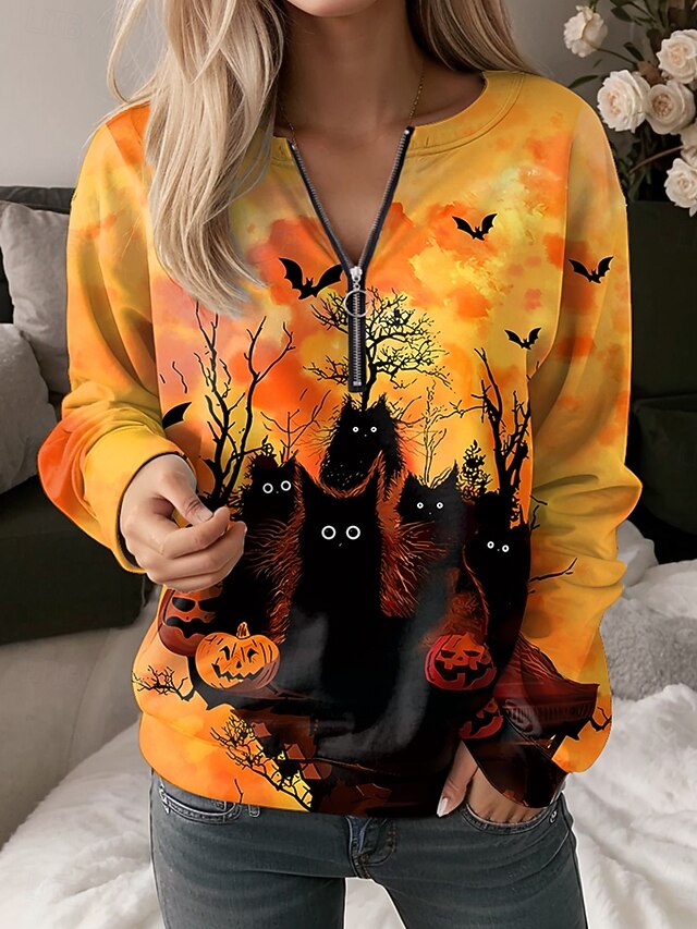 Why Choose Halloween Women's Quarter Zipper Sweater Black Cat Graphic Pumpkin Casual Long Sleeve Crew Neck Regular Tops Street Dailywear Half Print Black Yellow Orange Fall Winter?