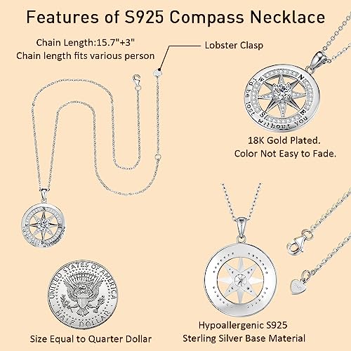 Item width: 0.94 inchesMaterial: Sterling SilverMetal type: SilverChain type: CrisscrossMetal weight: 4 ouncesGem type: Cubic Zirconia【Unique gift】compass necklace for women,I'd be lost without you ,You are my compass. Give this anniversary gift to your beloved to show her importance in your life.Be it for birthdays, anniversaries, Valentine's Day, Mother's Day or Christmas, this diamond necklace is perfect for women【Engraved with I'd be Lost without You】The compass pendant necklace is engraved with a love quote that can be sent to your loved ones, like wife, girlfriend, Mom, Daughter, sister, families,showing your forever and passionate love and tell her that you'd be lost without her and will be with her forever.【18k real Gold filled S925】The silver pendant necklace for women are made of S925 sterling silver with 18K white gold plating,The Chain, pendant, clasp is S925 sterling silver based. These safe materials are hypoallergenic and have oxidation resistance.This anniversary gift is not only a charming piece of jewelry, but also a precious gift that represents your love and care for her【5A cubic zirconia】This jewelry gifts for women is hand-set with 5 cubic meters of zirconia. The exquisite setting technique of the stones is not easy to fall off。Each gemstone is carefully selected to reflect the dazzling light of diamonds【Necklace for Women with a Jewelry Box and Gift Bag】Women's necklaces come with a beautiful gift box,ready to gift for her everytime Perfect for everyday use. superior materials and excellent craftsmanship ensure long-lasting durability.