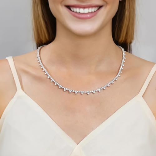 Material: Sterling SilverMetal type: SilverGem type: MoissaniteExquisite design: This moissanite tennis necklace is crafted from S925 silver and set with over 200 0.1-carat D-color laboratory diamonds,each of which is artificially set.Chain length:19 inches (48 cm),suitable for the size of most women.The exquisite design attracts everyone's attention and is perfect for your daily or special occasion outfits.Dazzling: Due to their astonishing resemblance to diamonds,moissanite is almost indistinguishable to the naked eye.What sets them apart is their dazzling fire - moissanite is brighter and has more vivid dispersion than diamonds.In addition to its beauty,moissanite is extremely solid and more resistant to impact than many gemstones,maintaining its luster.For those who want to purchase luxury jewelry at a high cost-performance ratio,moissanite is the perfect choice.Elegant appearance:Designed for effortless elegance,our tennis necklace features an upgraded spring clasp that combines secure fastening with easy wearability. Engineered to prevent accidental openings,safeguards your treasured investment while maintaining flawless style.Because true beauty should be both stunning and worry-free.Each piece arrives nestled in a luxurious gift box,meticulously crafted to unveil the perfect surprise for Valentine’s Day,anniversaries,birthdays,or any occasion worth celebrating.A timeless and elegant treasure,designed to cherish the extraordinary women in your life—be it your beloved wife,Dear mother,or even yourself. Because every moment of love deserves to be adorned with brilliance.EXCELLENT AFTER-SALE SERVICE: We appreciate the opportunity to serve you,and your satisfaction is our top priority. Perfect for everyday use. superior materials and excellent craftsmanship ensure long-lasting durability.