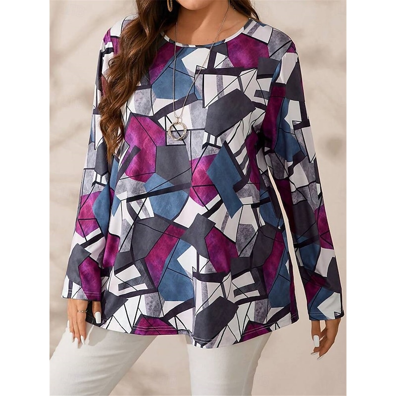 : Featuring a vibrant color block pattern, this top includes shades of purple, blue, grey, and white. The abstract geometric print creates a striking visual appeal, making it a standout piece in any wardrobe. The long sleeves enhance its suitability for cooler weather, while maintaining a chic and current look.