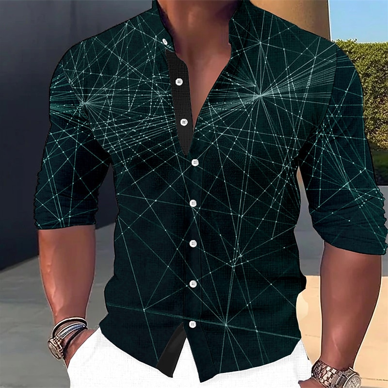 Highlights [Fabric]: Crafted from a high-quality polyester blend, this shirt ensures a lightweight and breathable experience, perfect for all-day wear. The durable fabric maintains its shape and appearance, even after multiple washes, offering both style and comfort. [Fit]: Featuring a regular fit design, this shirt provides a tailored yet relaxed silhouette that caters to a wide range of body types, making it an essential addition to any wardrobe for those seeking both comfort and style in their daily attire. [Design Highlights]: The standout element of this shirt is its striking geometric pattern, showcasing intersecting lines on a classic color palette of blue, brown, green, gray, and blue-green. The digital print is complemented by a sophisticated stand collar and contrasting white buttons, adding a modern touch to its overall design. [Occasions]: Ideal for a variety of settings, this versatile shirt is perfect for daily wear, casual outings, outdoor adventures, and even semi-formal events. Its sophisticated appearance and comfortable fabric make it suitable for spring, summer, and fall seasons. [Size Range]: Available in a comprehensive range of sizes from S to 3XL, this shirt caters to a broad audience, ensuring both comfort and a desirable fit for men across different size preferences. Perfect for everyday use. superior materials and excellent craftsmanship ensure long-lasting durability.