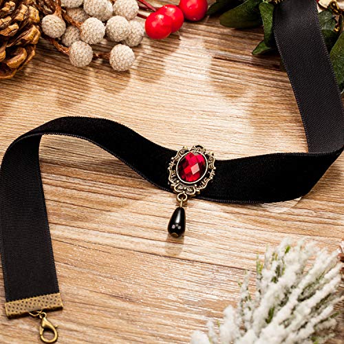 AnotherKiss Gothic Ruby Retro Black Velvet Choker Necklace for Women, Halloween Vampire Cosplay Jewelry