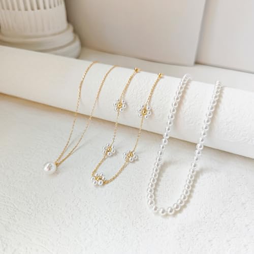 Pearl Necklaces for Women 14K Gold Plated Dainty Layered Single Pearl Necklace uncomplicated Daisy Pearls Choker Cute Gold Necklace Stack Jewelry Sets for Women Trendy Gifts