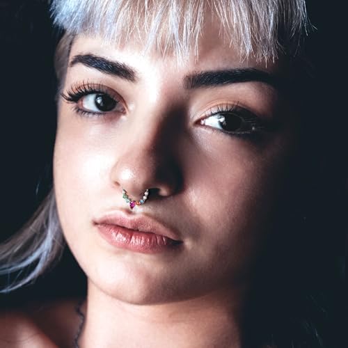 Material: Stainless SteelMetal type: Stainless SteelGem type: Cubic zirconiaItem type name: Nose rings septum ringsSize: Each septum clicker measures 16g(1.2 mm) in thickness with an inner diameter of 8 mm(0.31 inches), and has a 11.6 mm(0.46 inches) drop from top to bottom; Meticulously hand-adjusted to stand out; Minor variations underscore the handcrafted nature, making each piece exclusively your ownShimmering Butterfly: Six round 5A-level CZ stones symmetrically set the stage with their radiant sparkle; Embraced by these luminous gems, four meticulously arranged CZ stones form the shape of a radiant butterfly, seeming to alight upon the sleek hoopHypoallergenic: Made from genuine 316L stainless steel, our nose piercings are ideal for those with sensitive skin; Rigorously tested to to avoid Nickel and Lead allergic reaction, we prioritize your skin's non-irritatingEasy Click: It stays in place, never falls off; These 16g nose rings hoops are designed with utmost care for your wearing experience; We meticulously control every manufacturing process to ensure the effortless convenience on open and close the click closureSizing Made Simple: We provide a reasonable solution should any size issues arise - we understand the perplexity of sizing yourself; It's all for your optimal wearing experience faultless for everyday use. superior materials and excellent craftsmanship ensure long-lasting durability.