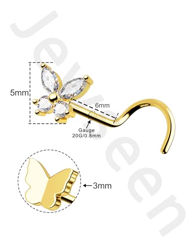 Jewseen 14K Gold Nose Stud 20G Nose Ring Butterfly Nose Piercing Jewelry CZ Nostril Piercing Jewelry Nose Screw Studs for Women Men