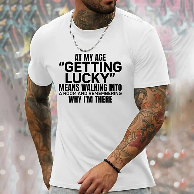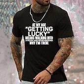 More information about Humorous Men's Graphic T-Shirt featuring 'At My Age Getting Lucky Means Remembering Why I'm There' Quote, Funny Aging Lifestyle Short Sleeve