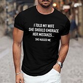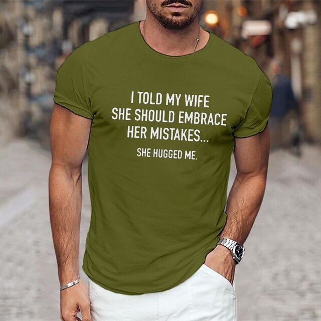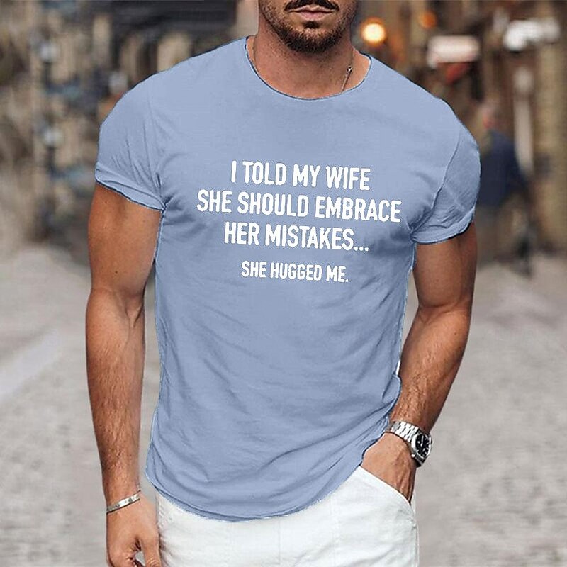 Highlights T-Shirt Description [Fabric] : Crafted from 100% soft, breathable cotton, this T-shirt provides comfort and ease, making it ideal for casual and relaxed settings. [Fit] : The classic short-sleeve design features a crew neck and a relaxed fit, offering both style and flexibility. Its micro-elasticity ensures that the tee retains its shape while providing comfort for daily wear. [Design Highlights] : The shirt showcases a witty graphic print saying, I told my wife she should embrace her mistakes… she hugged me, adding a playful touch of humor to your wardrobe. The interesting letter print is complemented by the choice of latest colors, including shades of Black, Dark Gray, Navy Blue, Blue, and Green. [Occasions] : Perfect for casual everyday wear, vacation outings, and street style. This versatile tee is a great fit whether you’re lounging at home, running errands, or out for a casual day with friends. [Size] : Available in a wide range of sizes, including S, M, L, XL, and XXL, to cater to different body types and ensure a comfortable fit for everyone. Perfect for everyday use. finest materials and excellent craftsmanship ensure long-lasting durability.