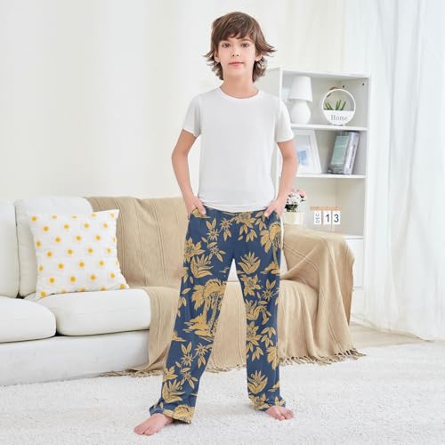 Golden Palm Tree Boys Long Pants velvety Trousers Elastic Waist Kids Lounge Bottoms with Pockets S-XL