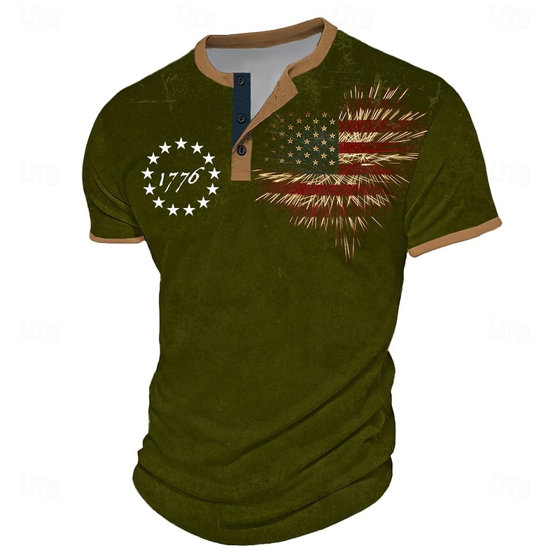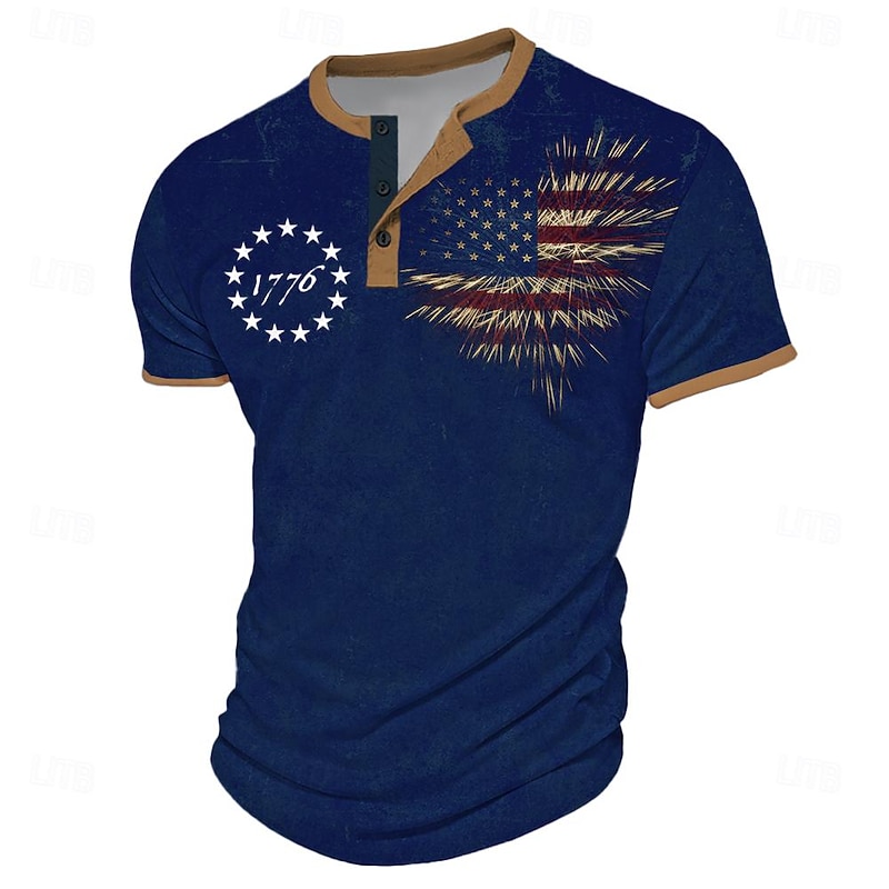 Highlights [Fabric]: Crafted from a breathable polyester material, this menβs T-shirt ensures comfort and ease throughout the day. The fabric offers a micro-elastic fit, allowing for effortless movement and a lightweight feel in warm weather. [Fit and Style]: Featuring a regular fit, this T-shirt is designed for a relaxed, comfortable wearing experience. The classic henley neckline is accented with a contrast trim button placket, adding a versatile and sophisticated element to this casual piece. [Design Highlights]: The T-shirt stands out with its bold 3D graphic print inspired by the American flag, complete with fireworks and the year 1776 for a vintage, patriotic look. Short sleeves with matching contrast trim provide a cohesive and polished finish. [Occasions]: Ideal for a variety of occasions, this versatile T-shirt suits streetwear, parties, and daily casual wear. It is particularly fitting for patriotic events such as American Independence Day, making it a standout choice for showcasing national pride. [Size Notice]: Available in a wide range of sizes from S to 3XL, ensuring a suitable fit for various body types. Perfect for everyday use. superior materials and excellent craftsmanship ensure long-lasting durability.
