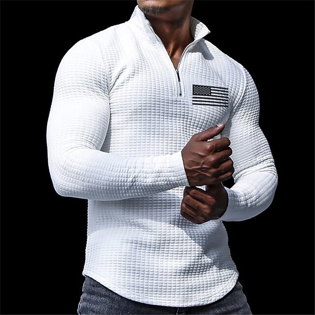 Highlights [Fabric & Fit] : Crafted from a high-quality polyester waffle fabric, these Men's National Flag Polo Shirts offer a modern, athletic fit that comfortably contours to your body. The fabric provides both warmth and breathability, making it an ideal choice for cooler weather. [Design Highlights] : Featuring a half-zip front design that allows for easy wearing and removal, these shirts stand out with a one-of-a-kind monochrome American flag patch on the chest. The turndown neckline and 3D print give the shirt a contemporary edge, while the textured waffle-knit pattern adds depth and a cozy feel to the garment. [Occasions] : These versatile polo shirts are perfect for casual daily wear, outdoor adventures, and streetwear. Whether you're heading out for a casual meeting or a golf session with friends, this shirt provides both style and functionality, making it an ideal choice for various occasions. [Size Range] : Available in a wide range of sizes from S to 3XL, ensuring a suitable fit for different body types. The design combines the casual charm of everyday wear with the smart appeal of business attire, making it a reliable addition to your seasonal wardrobe. Perfect for everyday use. top-grade materials and excellent craftsmanship ensure long-lasting durability.