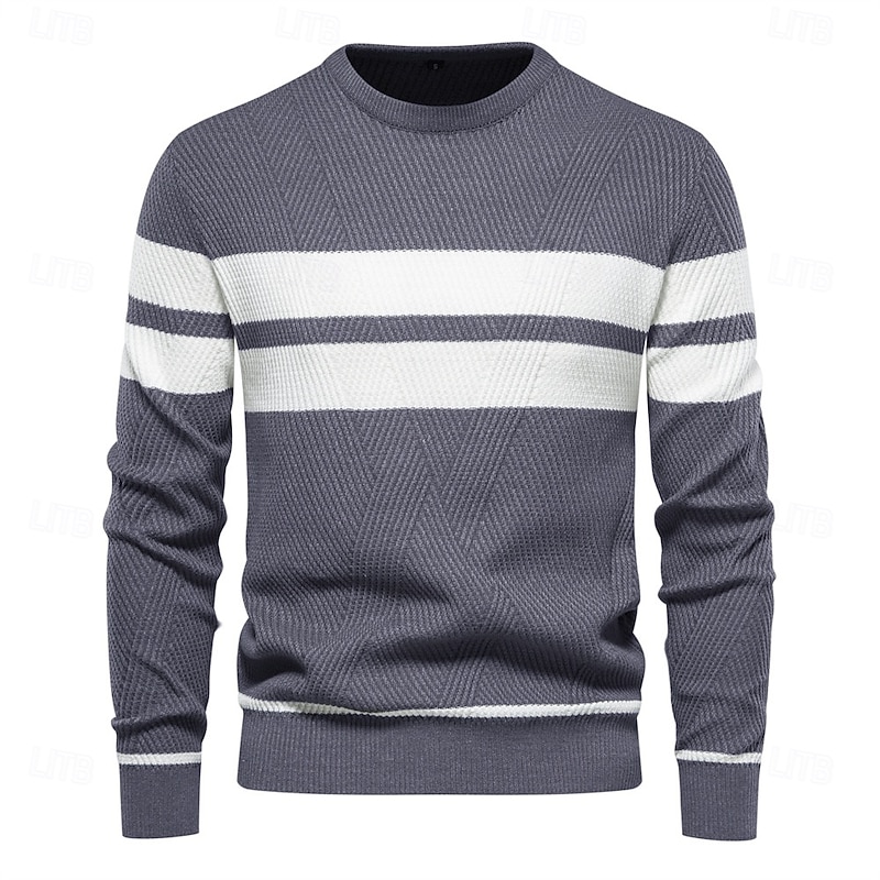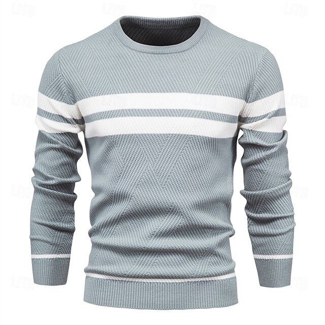 Highlights Product Highlights [Fabric and Comfort] : Constructed from a soft and breathable knitted fabric, this men's pullover sweater ensures warmth and comfort in the cooler months. The micro-elastic material provides just the right amount of flexibility for all-day wear. [Fit and Style] : Designed as a slim-fit piece, this sweater flatters the silhouette while allowing plush movement. Ribbed cuffs and a ribbed hem offer a snug fit, helping to retain warmth and create a sleek look. [Design Highlights] : This sweater features a enduring crew neckline, complemented by a contemporary light blue hue accented with two contrasting white stripes across the chest and sleeves. The subtle geometric pattern of the fabric adds visual interest without overwhelming the design. [Occasions] : Ideal for casual daily wear, this versatile sweater elevates your everyday wardrobe. It is perfect for winter, fall, or any casual outing where comfort meets style. [Size Range] : Available in sizes S, M, L, XL, and XXL, ensuring a fit that's right for a variety of body types.