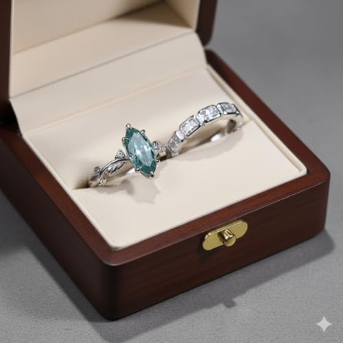 Ring size: 4Material: Silver, Rose Gold, Yellow GoldMetal type: Silver, Rose Gold, Yellow GoldMetal weight: 5.5 gGem type: MoissaniteBrilliant Marquise Cut Center Stone: Showcasing a striking teal blue-green marquise cut moissanite, this ring radiates brilliance and sophistication from every angle. The elongated shape enhances finger elegance while the vivid, ocean-inspired color adds a rare and captivating charm that makes it stand apart from traditional gemstones.Romantic Vintage-Inspired Design: The engagement ring band is adorned with intricate vine and leaf details, delicately wrapping around the center stone to symbolize growth, eternity, and the natural beauty of love. Every detail is thoughtfully handcrafted, making this ring a timeless heirloom piece to be cherished for generations.Elegant Matching Eternity Band: Complementing the solitaire ring is a square-cut diamond eternity band, meticulously set with sparkling stones that shimmer with every movement. This band perfectly aligns with the engagement ring, completing the bridal set with grace, balance, and a sense of everlasting unity.Finest Craftsmanship & Premium Materials: Handcrafted by skilled artisans, this ring set is made with precision and care, ensuring lasting beauty and durability. Available in sterling silver, rose gold, or yellow gold, it allows you to select the perfect finish to match your one-of-a-kind style and personality.Fully Customizable & Personalized for You: Make this ring set truly your own with thoughtful customization options. Choose your preferred metal finish, stone size, engraving, or even adjust the design elements, creating a one-of-a-kind piece that reflects your personal love story and captures your forever promise in the most meaningful way. Perfect for everyday use. top-grade materials and excellent craftsmanship ensure long-lasting durability.
