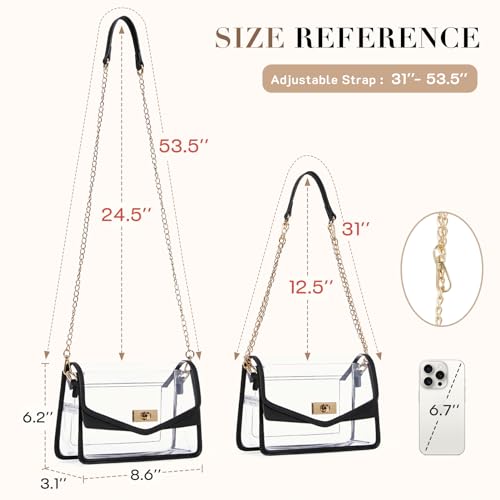 • Roomy Capacity: The clear crossbody bag has a main compartment + 1 inside pocket; The main compartment offers ample space for your mobile phone, sunglasses, and cosmetics. The Inside pocket helps you hold keys, tickets, ID cards, and so on for effortless access daily. Flip cover design and rotating clasp switch make it easy to access items
