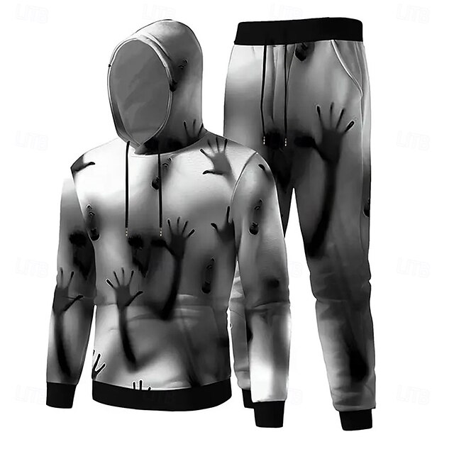 sizzling ! Halloween Men's Hand 2pcs 3D Sweatshirt Sets Tracksuit Hoodie Sweatshirt Long Sleeve Long pants Hooded Casual Daily Horror Athleisure 3D Print Spring Fall Winter Grey