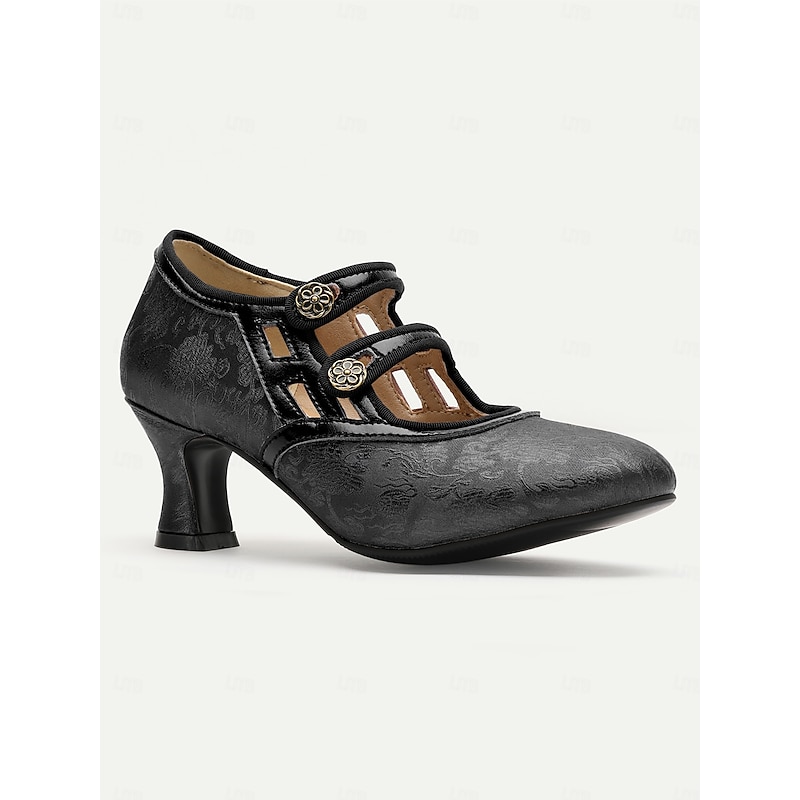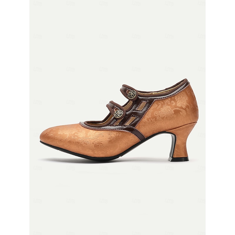Highlights [Fabric] These elegant women's pumps are crafted from premium PU and microbial leather, featuring a luxurious brocade-like texture that echoes classic vintage styles. The rich bronze color, combined with intricate floral embroidery, creates an opulent look that's perfect for both retro and modern aesthetics. [Silhouette] The pumps boast a classic almond-shaped toe that exudes timeless charm, while the mid-heel design ensures both comfort and style, ideal for extended wear. The stiletto heel adds just the right amount of height, balancing elegance with practicality. [Design Highlights] These shoes feature distinctive cut-out detailing on the front, bordered with dark brown leather for a striking contrast. The decorative metallic buttons and floral embellishments enhance the vintage feel, lending an air of sophistication to the overall design. An ankle strap with a buckle closure ensures a secure and flattering fit, while the color block pattern adds visual interest. [Occasions] Perfect for both formal occasions and relaxed outings, these pumps seamlessly transition from a festive Oktoberfest celebration to daily workwear or casual gatherings. Their exceptional blend of vintage flair and modern comfort makes them versatile enough to complement a range of outfits. [Size Notice] Available in a range of sizes from US6 / EU36 / UK4 to US12 / EU42 / UK10, these pumps are designed to accommodate your usual size selection, ensuring a comfortable and consistent fit. Perfect for everyday use. superior materials and excellent craftsmanship ensure long-lasting durability.