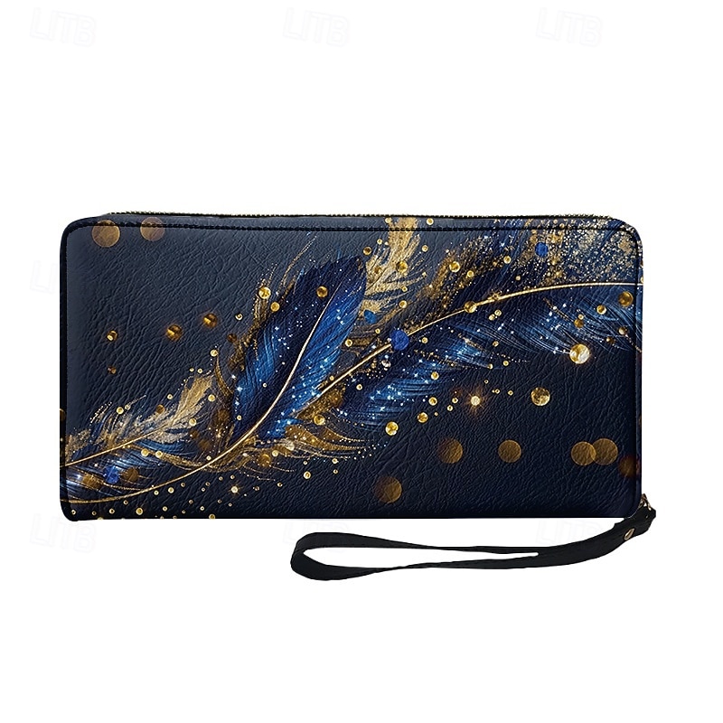 sizzling ! Women's Large Capacity Wallet with Gilded Feather Print, Zipper Closure, Wristlet and Multiple Card Slots - contemporary and Practical for Daily Use, Travel and Gift Giving Red Blue Green
