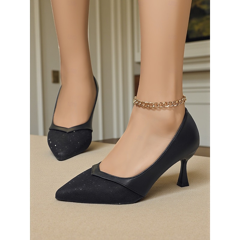 Why Choose Women's Black Lace and Glitter Pointed Toe Kitten Heels – Elegant Faux Leather Dress Pumps for Office, Parties, and Evening Wear?